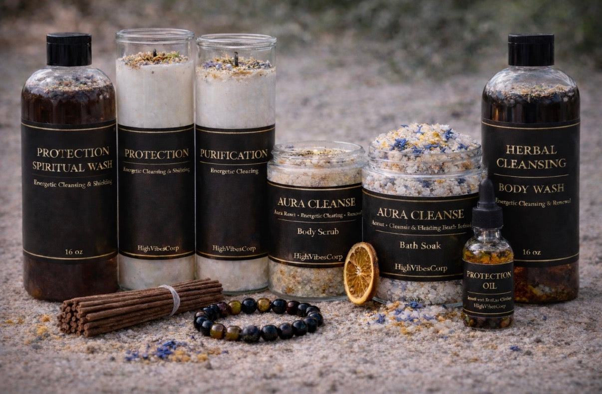 The Spiritual Protection Bundle is a complete protection and cleansing system designed to clear energetic attachments, strengthen spiritual boundaries, and restore a sense of safety, clarity, and sovereignty. It supports energetic hygiene and reinforces your ability to move through the world without carrying what is not yours.